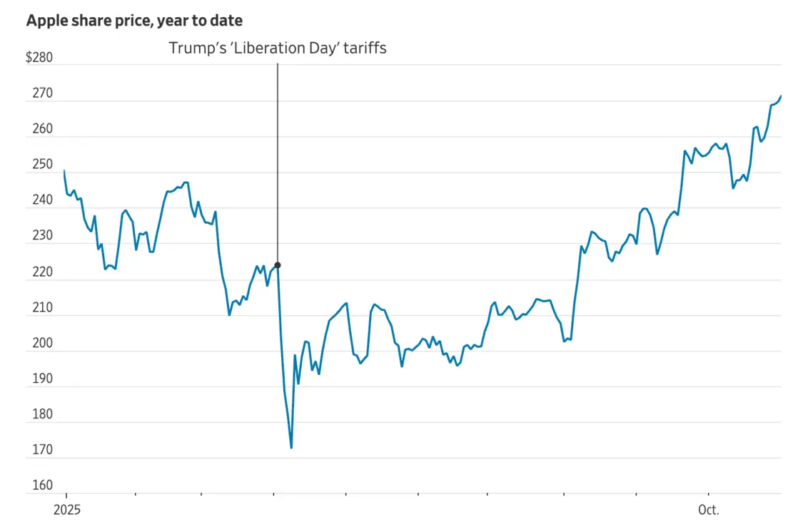 由于大多数iPhone仍在中国生产,当特朗普在4月份的“解放日”宣布征收大规模进口关税时,投资者陷入恐慌。苹果股价在随后几天暴跌逾20%。
