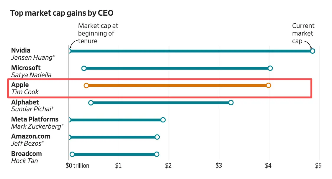 而仅仅六个月之后,库克就让苹果的市值首次站上4万亿美元。这一市值是他14年前从史蒂夫·乔布斯(Steve Jobs)手中接任CEO时的10倍以上。