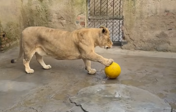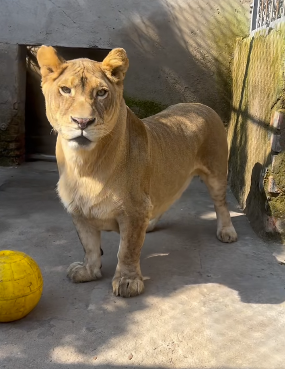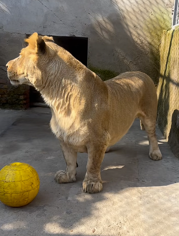 据动物园介绍,这只狮子2022年从上海野生动物园转至徐州,出生后因腿部发育异常遭母狮弃养,全程由人工饲养长大。