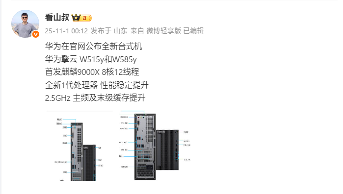 据博主看山叔爆料,擎云W515y/W585y将首发搭载麒麟9000X处理器,拥有8核12线程,2.5GHz主频,末级缓存提升,此前的W515x/585x则是搭载的麒麟9000C。