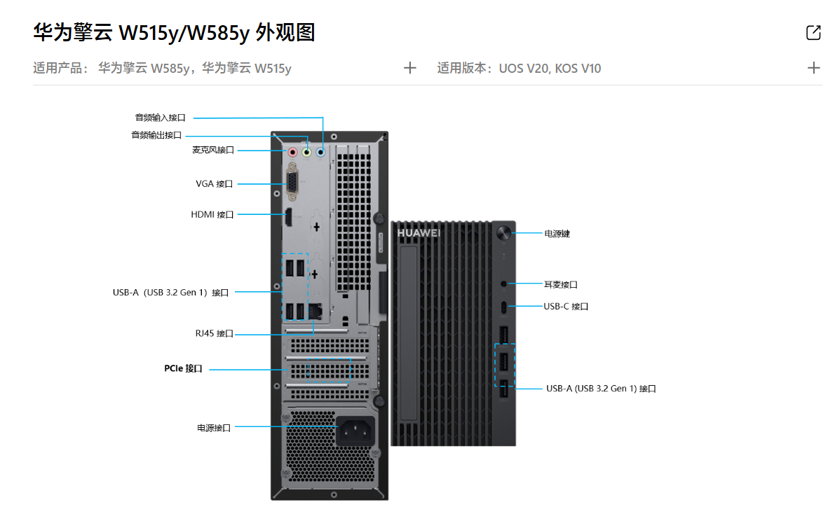 华为官网公布了最新台式机擎云W515y/W585y的部分信息,并展示了外观图。从图片来看,新机与之前已上市的W515x/585x外观保持一致。提供了丰富的接口规格,包括前置的3.5mm音频接口、USB-C接口和USB-A接口,以及后置的多种视频、音频、USB、网络接口等。