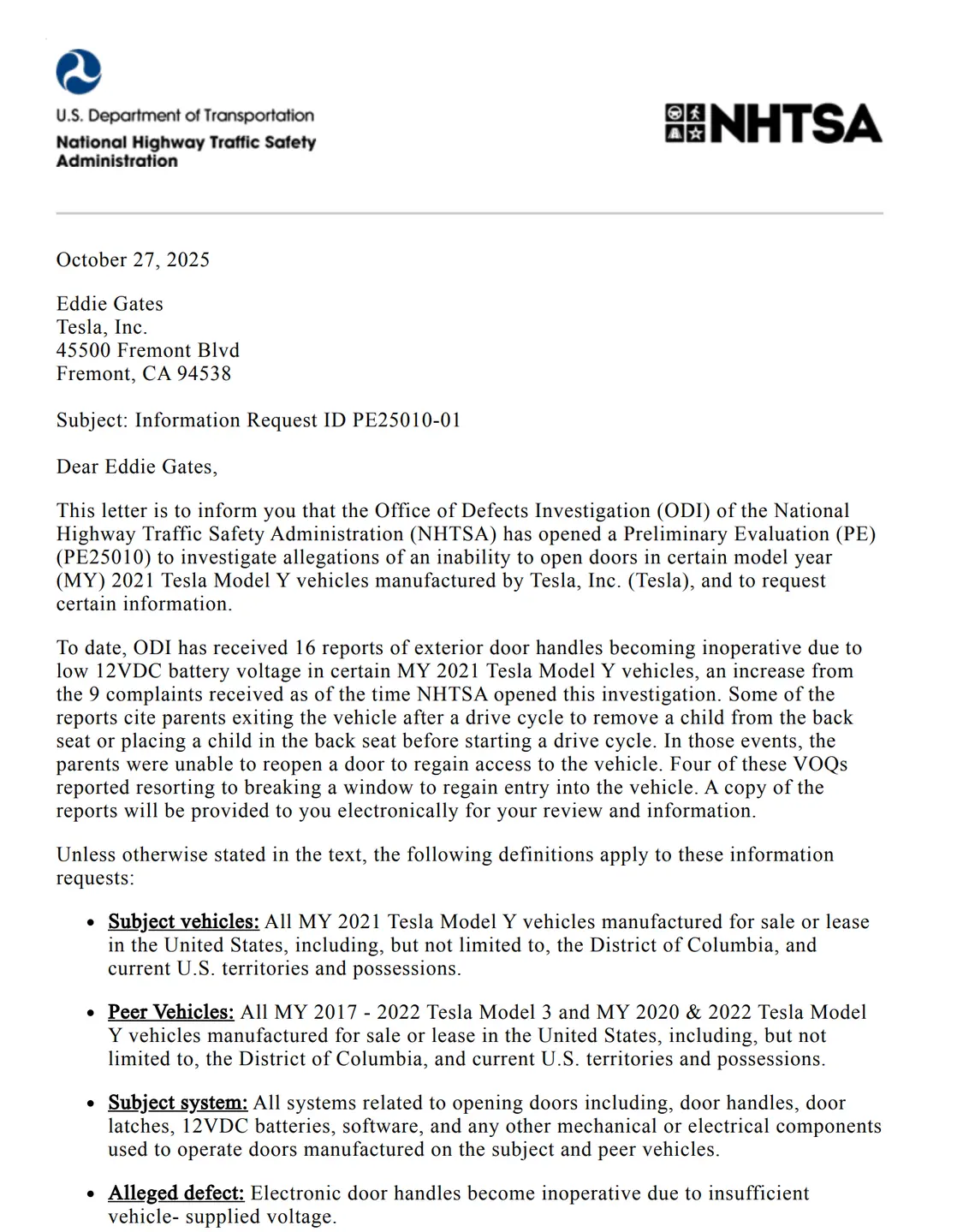 根据NHTSA的信件,特斯拉必须在12月10日前向其提交答复。
