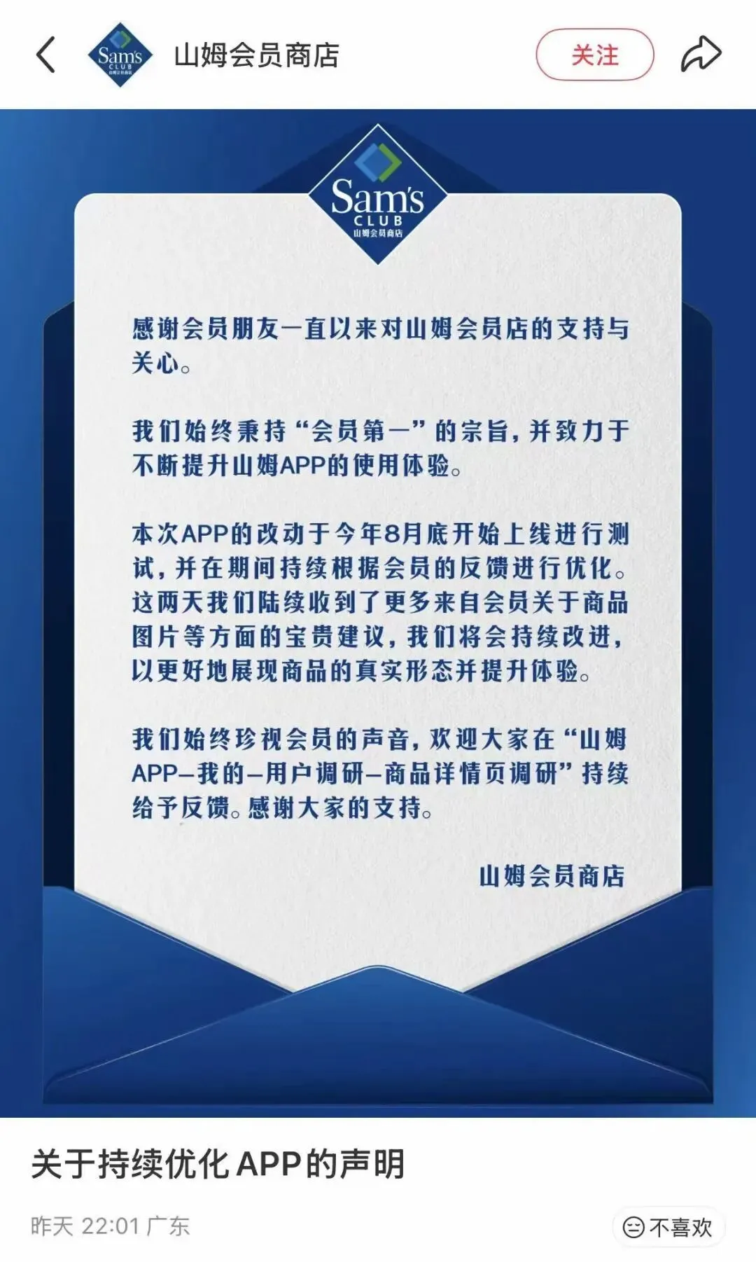 山姆的声明刻意强调APP改动是在8月份开始,算侧面回应了网友们对新高管的质疑。