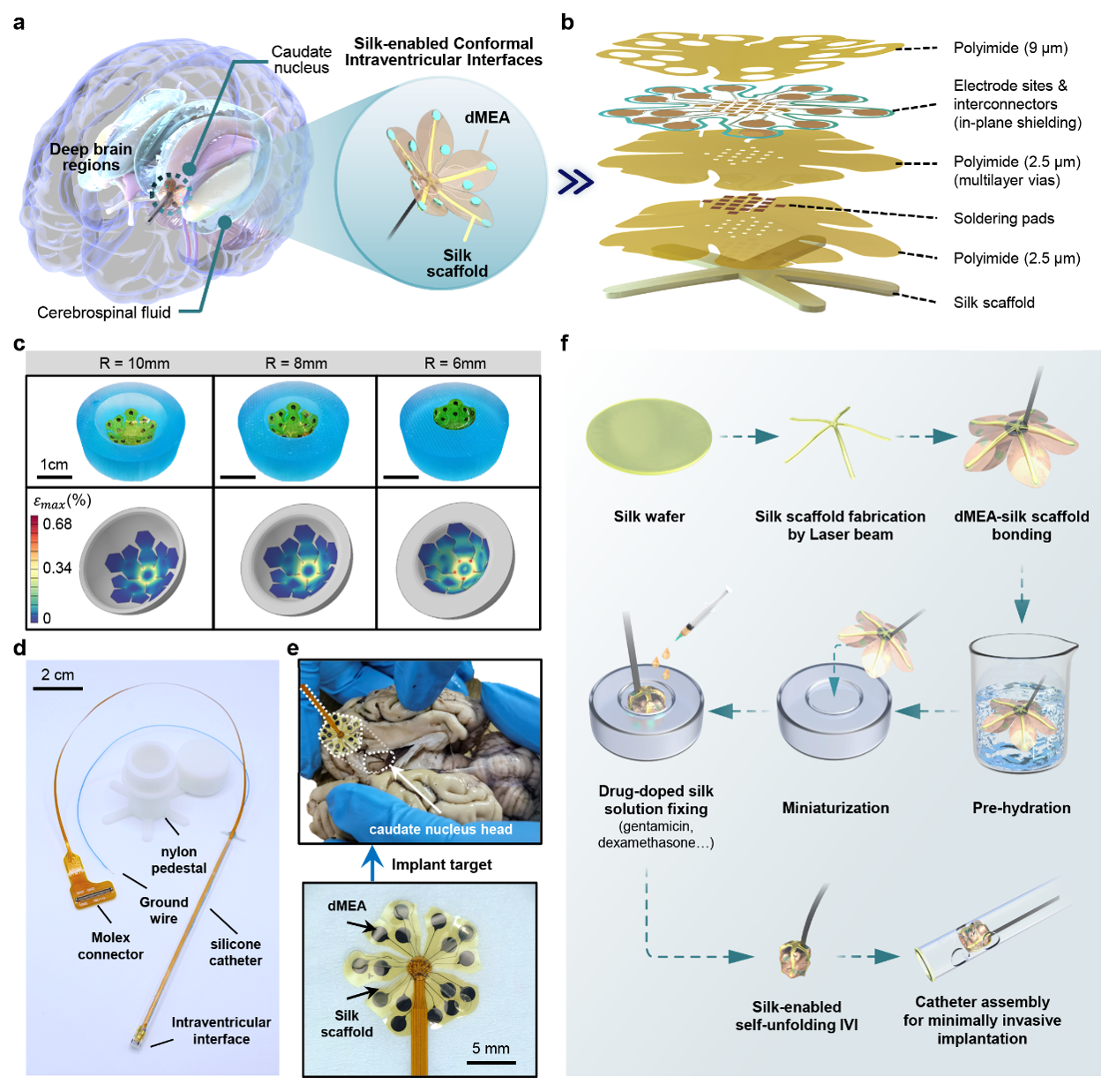 中科院团队的创新方案完美破解这一矛盾——将形状记忆丝蛋白支架与可变形微电极阵列结合,器件可微型化装入临床常用微创手术导管,实现微创递送。