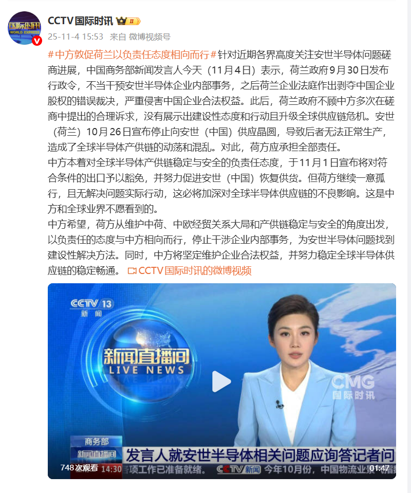 11月4日消息,据央视报道,针对近期各界高度关注安世半导体问题磋商进展,中国商务部新闻发言人今天表示,荷兰政府9月30日发布行政令,不当干预安世半导体企业内部事务,之后荷兰企业法庭作出剥夺中国企业股权的错误裁决,严重侵害中国企业合法权益。