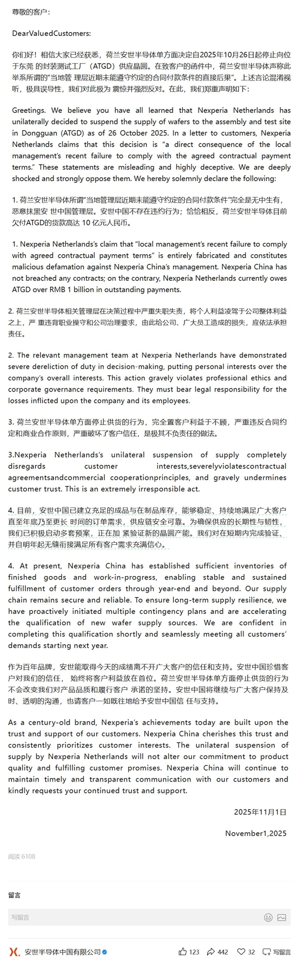 11月2日凌晨,安世半导体中国有限公司发布《安世中国致客户公告函20251101》。公告函称,荷兰安世半导体单方面决定自2025年10月26日起停止向位于东莞的封装测试工厂(ATGD)供应晶圆。
