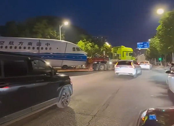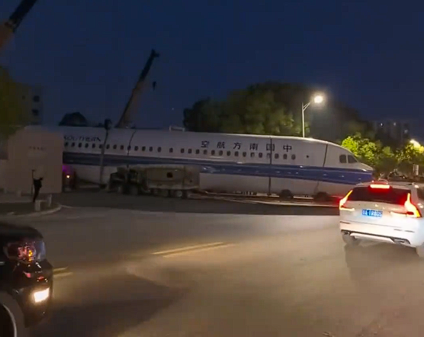 画面中,夜晚街头道路上出现一架大型客机,机身上印有“中国南方航空”的字样,不少市民驻足观看,有人甚至直接从车里下来围观,可见着实被震惊了到了。
