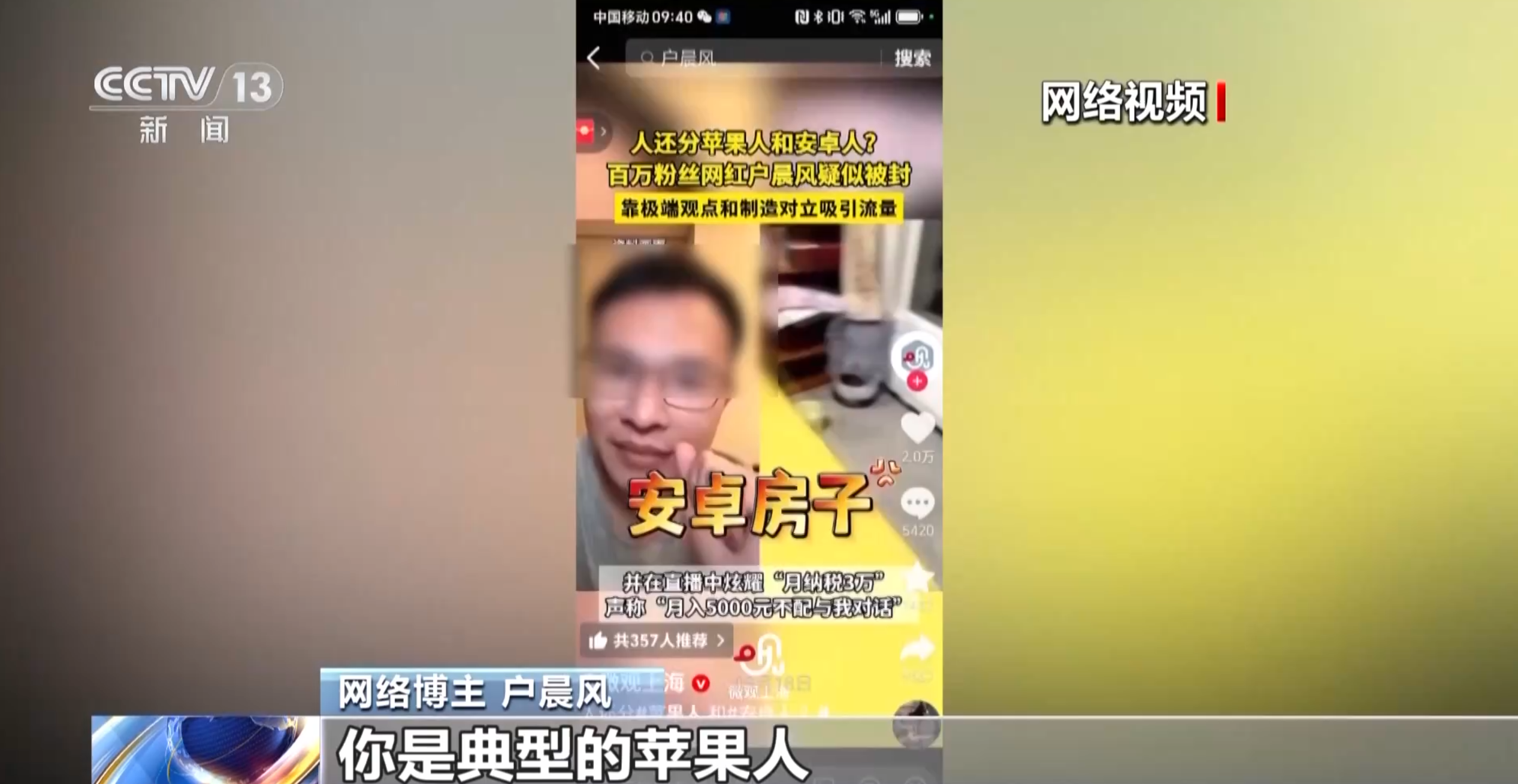 节目还提到了拥有百万粉丝的网红博主户晨风,从展示跨国消费差异到制造阶层对立,户晨风以“苹果、安卓论”收割流量,终因突破监管红线。