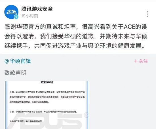 今日,华硕官方发布致歉声明。声明指出:近期,华硕官旗账号发布的《关闭ACE反作弊系统,保护你的电脑性能》视频存在错误描述和不实评价,对腾讯游戏安全ACE造成不良影响,引发玩家们对软件安全及电脑性能稳定性上的担忧,在此华硕深表歉意。目前,华硕已第一时间下架了该视频,并正在内部进行严肃核查与流程梳理。