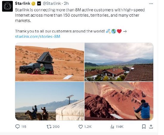 马斯克的卫星互联网服务星链(Starlink)在X上的官方账号宣布,其全球用户数量已突破800万,“Starlink在150多个国家、地区和许多其他市场为800多万活跃用户提供高速互联网服务。”这距离星链用户数量突破700万刚刚过去不到三个月。