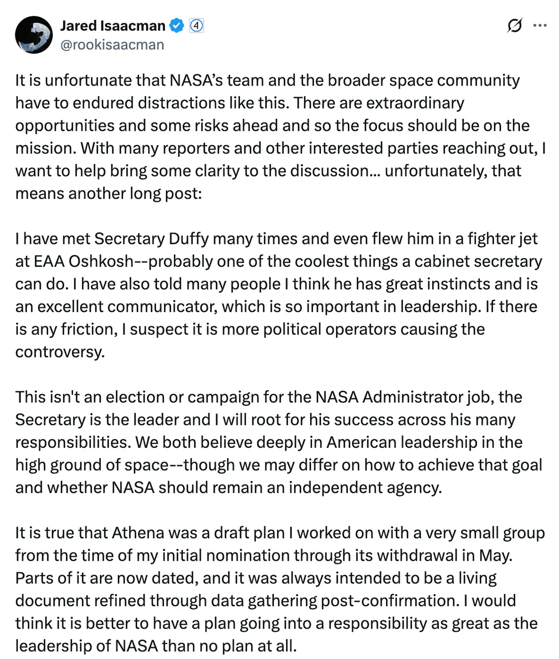 艾萨克曼周三在X上确认了这份计划草案,但表示部分内容已经过时。“该文件始终是一份动态文件,需在提名确认后根据收集的数据不断优化完善。”他表示。