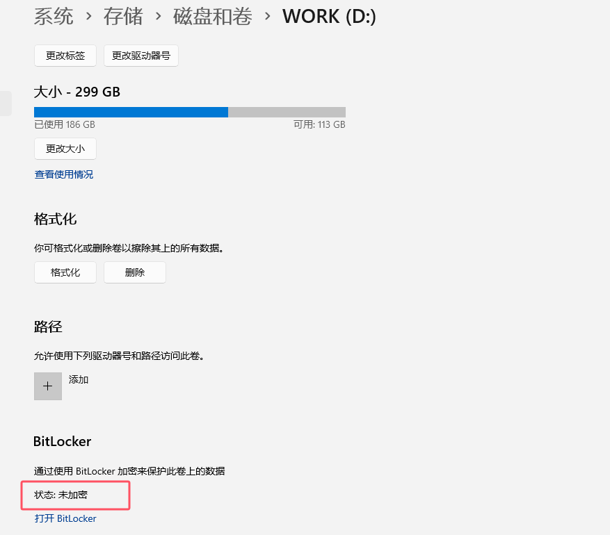 如果需要确认自己的硬盘是否开启BitLocker,可以进去系统设置、存储、高级存储设置、磁盘和卷,在各个分区(卷)的属性中查看,如果显示“状态:未加密”就可以放心了。
