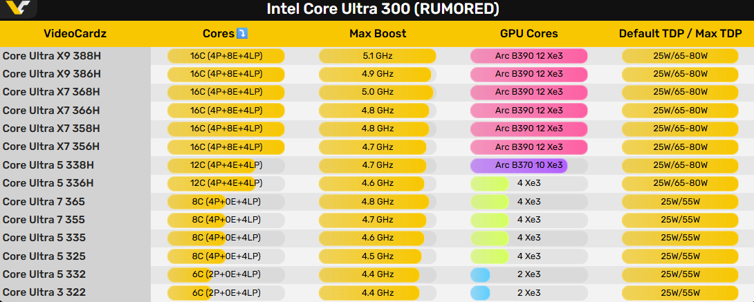 在公布了全部架构、技术细节后,Intel下一代移动端处理器Panther Lake,也就是酷睿Ultra 300系列,终于曝光了全部型号命名。这次CPU核心配置、睿频频率、核显规格、热设计功耗(PL1)都有了,但暂时没有基础频率、二三级缓存、核显频率。