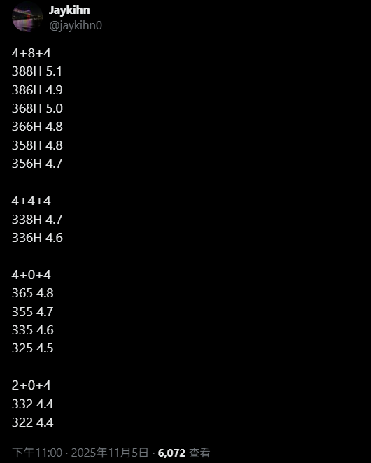 酷睿Ultra 300系列一共六款,7 365/355、5 335/325四款都是4P+4LP 8核心,4个Xe3核心,睿频4.5-4.8GHz。