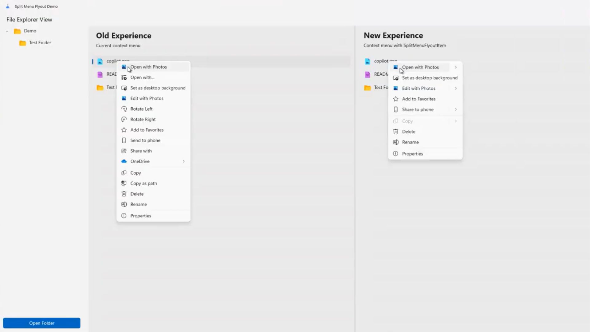 该新功能由WinUI3控件驱动,适配于最新的Windows App SDK。SplitMenuFlyoutItem让上下文菜单更具混合属性,左半部分为主要操作,右半部分为带下拉箭头的副操作。例如普通图片文件,“用Photos打开”是主操作,“用Paint编辑”等次操作则归入右侧子菜单。系统还能依据历史使用习惯,将最常用工具智能置顶显示。