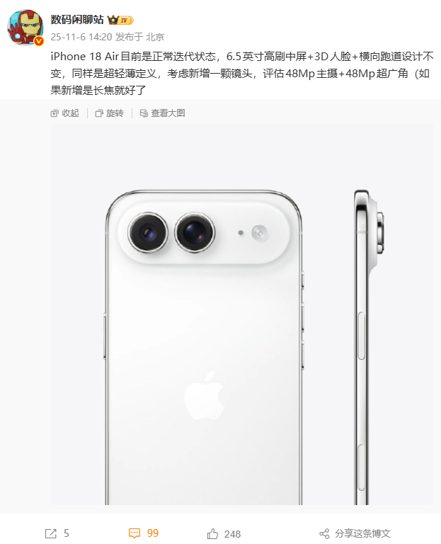 今日,数码博主“数码闲聊站”透露,iPhone 18 Air(iPhone Air 2)目前是正常迭代状态,依然是6.5英寸高刷中屏+3D人脸+横向跑道设计,同样是超轻薄定义。此外,苹果还考虑为全新iPhone Air新增一颗镜头,评估4800万像素主摄+4800万像素超广角镜头。