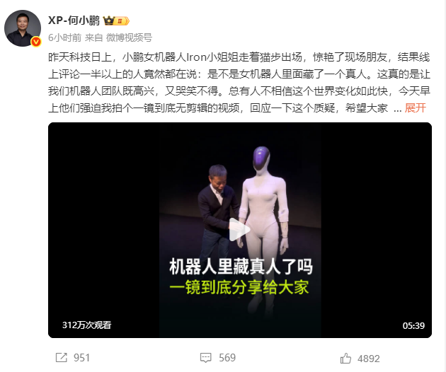 11月5日,在小鹏科技日上,小鹏研发的全新一代人形机器人IRON登台亮相。有网友评论称“感觉是个真人在努力扮演机器人”。今日上午,何小鹏回应:昨天科技日上,小鹏女机器人Iron小姐姐走着猫步出场,惊艳了现场朋友,结果线上评论一半以上的人竟然都在说:是不是女机器人里面藏了一个真人。