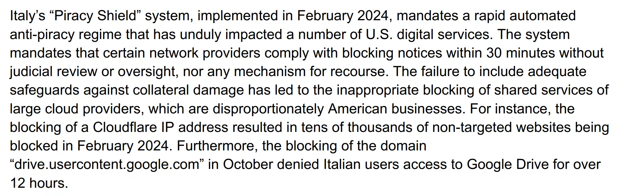 在意大利,“Piracy Shield”反盗版系统要求网络与CDN服务商在30分钟内执行封锁指令。美国公司指出,缺乏足够保障措施导致大批非相关网站被误封。例如,2024年2月,Cloudflare的IP地址被封锁,致使数万个网站无法访问;2024年10月“drive.usercontent.google.com”域被屏蔽,令意大利用户长达12小时无法访问Google云端硬盘。Cloudflare称,意大利法院允许权利人“滥用”司法程序,发出单方封锁令,企业无权抗辩,这种做法严重影响了在意大利的商业活动。