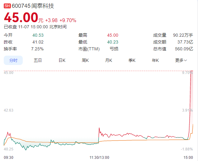 今日午后,闻泰科技尾盘逆势直线拉升,股价大涨9.7%逼近涨停,最终以45元/股收盘,总市值达到了560.09亿。值得一提的是,在最后5分钟,闻泰科技股价成交额超12亿元。消息面上,据媒体报道,荷兰政府11月7日发表声明,该国经济大臣卡雷曼斯对中方为安世中国工厂恢复供货提供便利的表态表示欢迎。