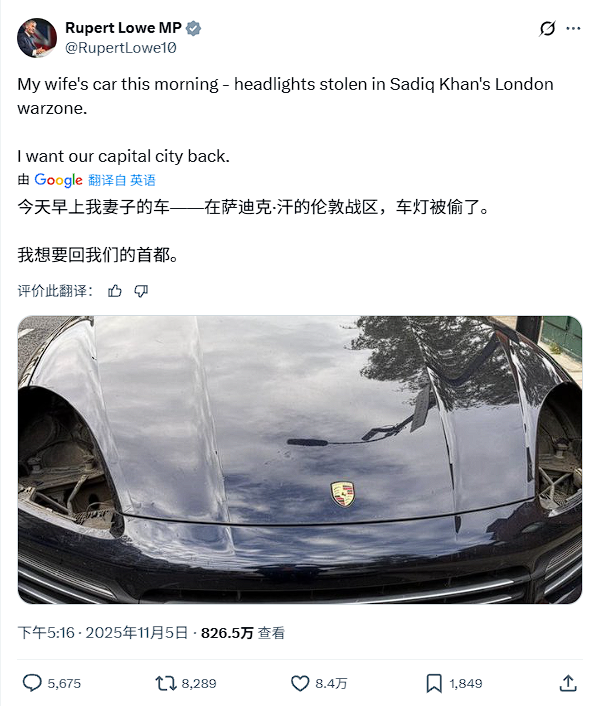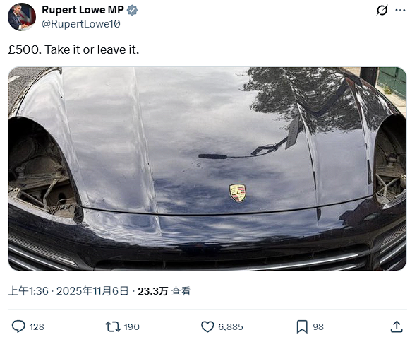 近日,英国独立议员鲁珀特・洛维 (Rupert Lowe) 在社交媒体上发布爱车照片并愤怒配文:“我妻子的车今早被偷了大灯。”这条帖子迅速走红,获得超过8.4万点赞和8000多次转发,成为英国政治圈和媒体热议话题。