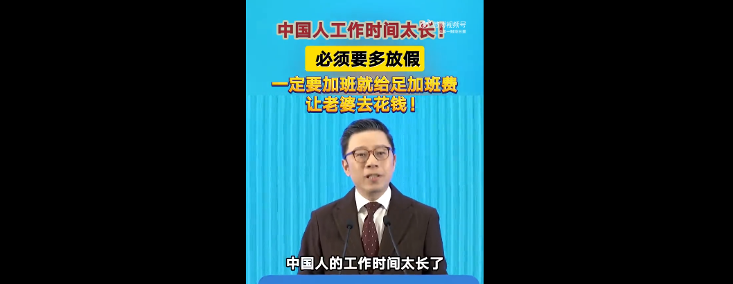 “中国人工作时间太长,必须要多放假,一定要加班就给足加班费,让老婆去花钱(刺激消费)!”这位教授说道。