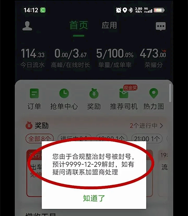 至于平台给出的封号理由是“合规整治”,并表示司机如有疑问请联系加盟商处理。