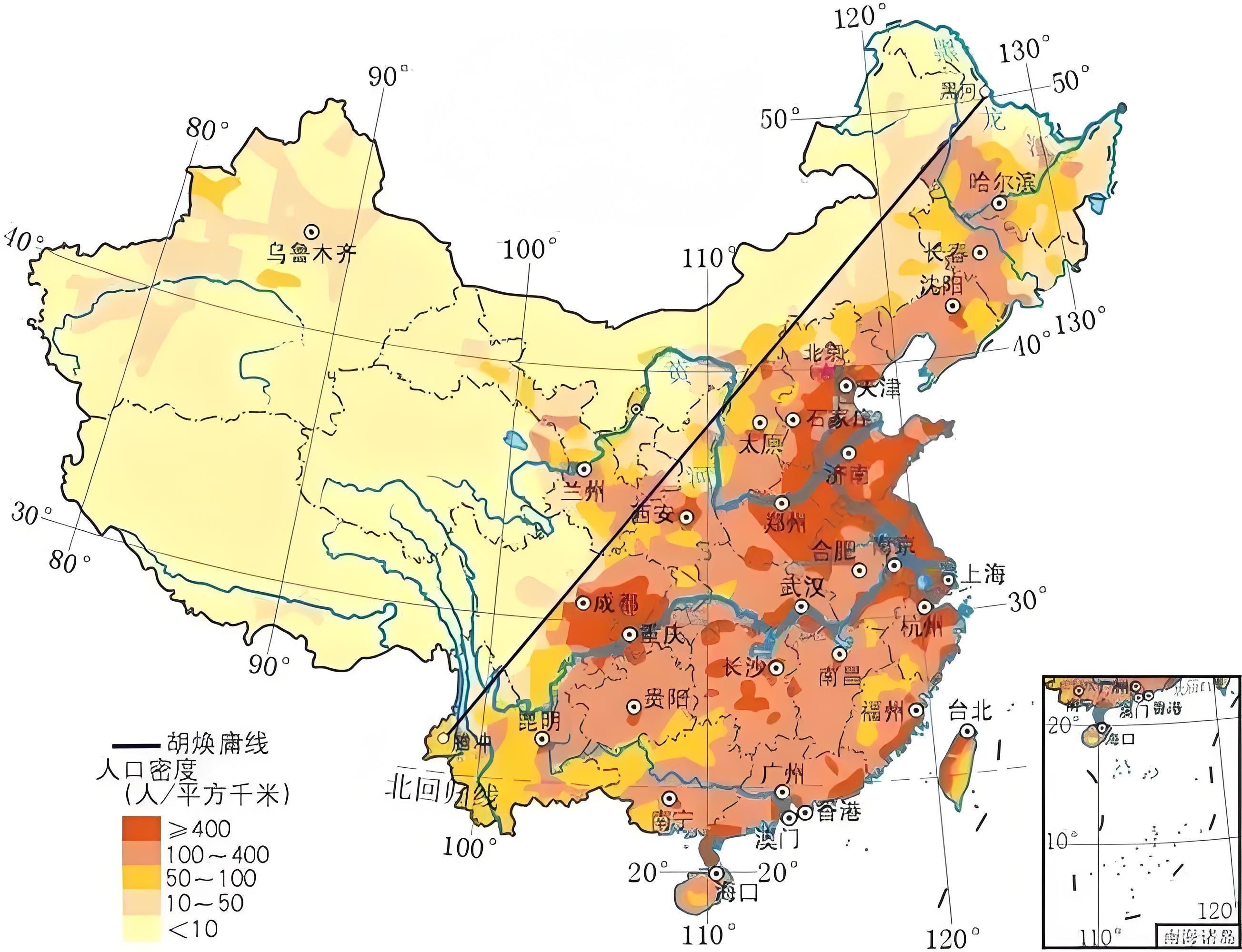这里更是中国人口地理分界线“胡焕庸线”的西南端点(东北是黑河市),倾斜约45度,全长约4000公里:线东南侧以平原、丘陵为主,集中了全国约94%的人口;线西北侧以高原、山地为主,人口占比仅约6%。