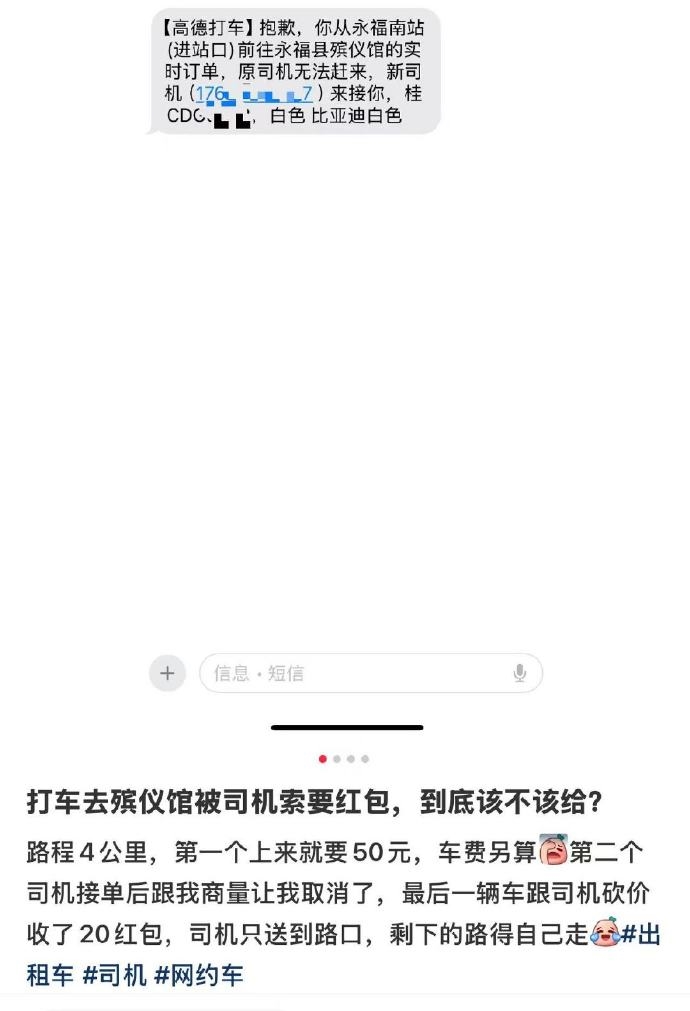 近日,广西桂林,一名网友发帖称,自己在打车前往殡仪馆途中,被多个网约车司机索要红包。该网友描述,11月8日他打车前往殡仪馆,全程约4公里。第一次叫车后,司机以目的地是殡仪馆为由,要求支付50元红包当作“利是”,车费另算。