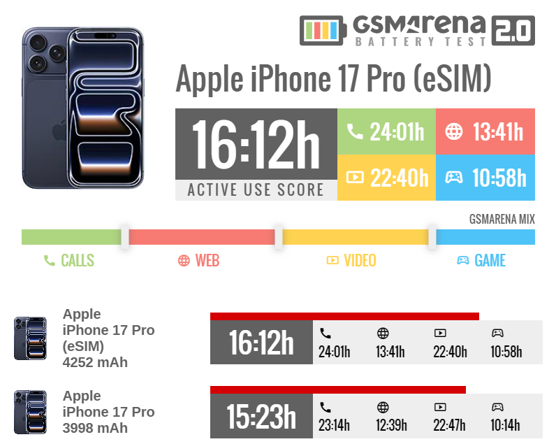 GSMArena按标准化流程测试,eSIM版iPhone 17 Pro综合续航16小时12分钟,较实体SIM版(15小时23分钟)多出49分钟,整体提升5.3%。