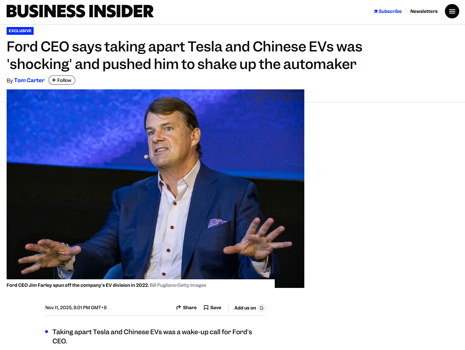 据《商业内幕》报道,在即将播出的博客节目中,福特CEO吉姆·法利表示,他对特斯拉和中国造车新势力的领先成都感到震惊,这也推动了他对公司进行改革的决心。法利透露,当我们拆解第一辆特斯拉Model 3和中国汽车时,我们发现的东西令人震惊。