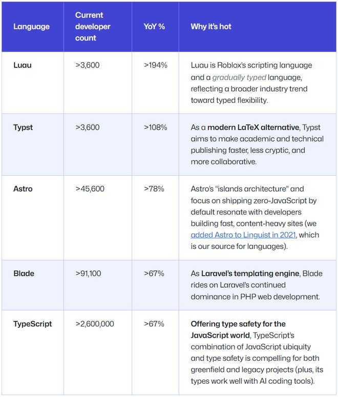 增长最快的语言是 Luau。Luau 是 Roblox 的脚本语言,也是一个逐步类型化的语言,体现了整个行业向“类型灵活性”发展的趋势。