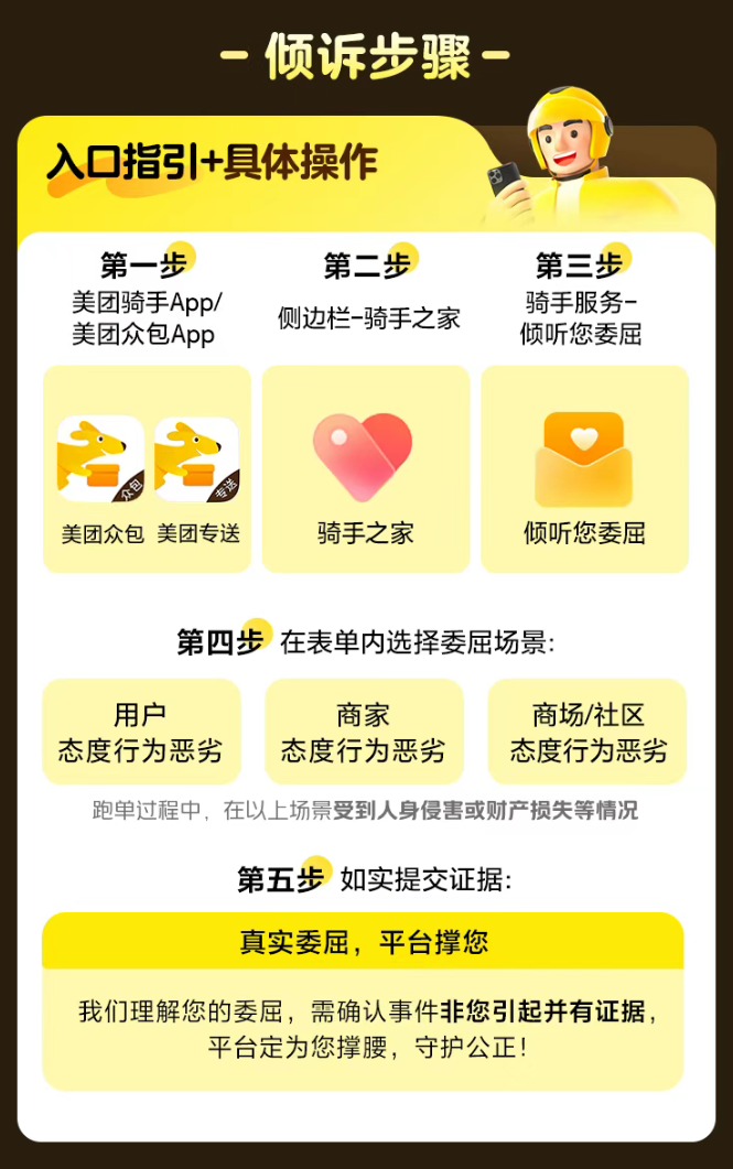 据介绍,一经核实属“非骑手责任”的委屈事件,审核通过后,美团将提供最高5万元的委屈安抚金,外加平台法律援助。