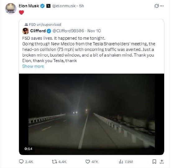 特斯拉CEO埃隆·马斯克在社交平台X上转发了一位特斯拉股东和Cybertruck车主的帖子,这位车主称其夜晚驾车在高速公路上行驶时险些与一辆逆行车辆相撞,幸亏在FSD的帮助下及时避开,并向马斯克和特斯拉表示感谢。