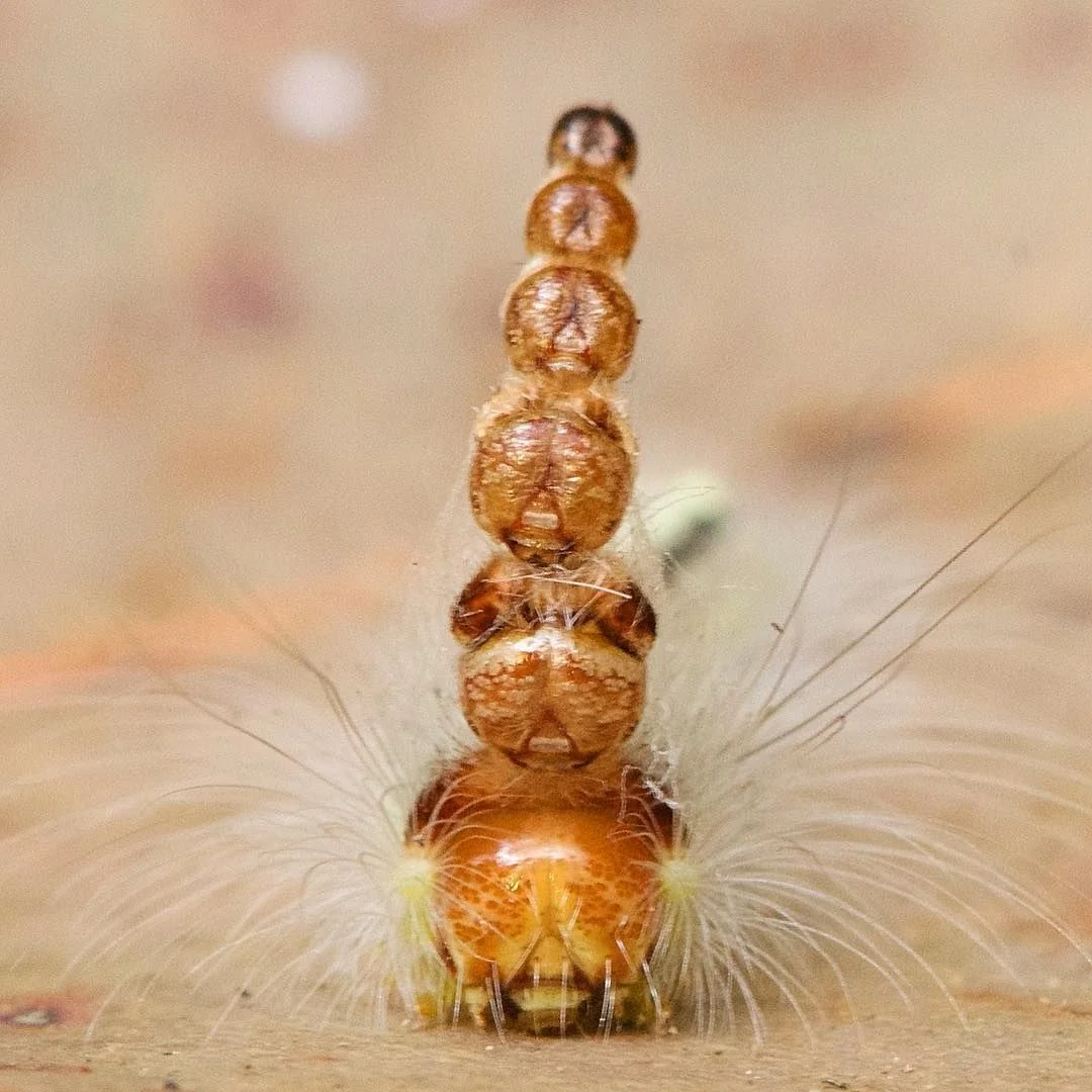 还有一个就是有“疯帽子”之称的毛毛虫(Uraba lugens),它的幼虫脑袋上顶着好几个“脑袋”,就和高塔一样。