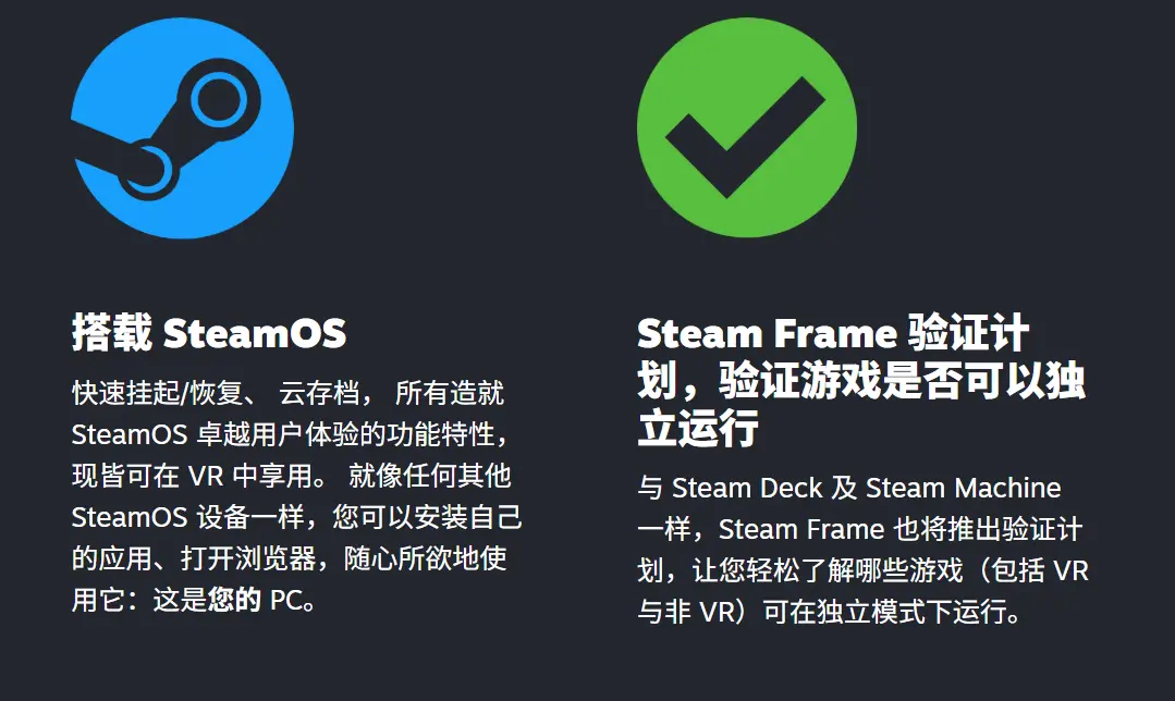 官网特别强调:Steam Frame 是台 PC,搭载由骁龙® 8 系处理器驱动的 SteamOS。配备 16GB 内存,支持以独立运行方式畅玩 VR 与非 VR 游戏,而无需从 PC 上流式传输,且兼容游戏的数量将不断上升。