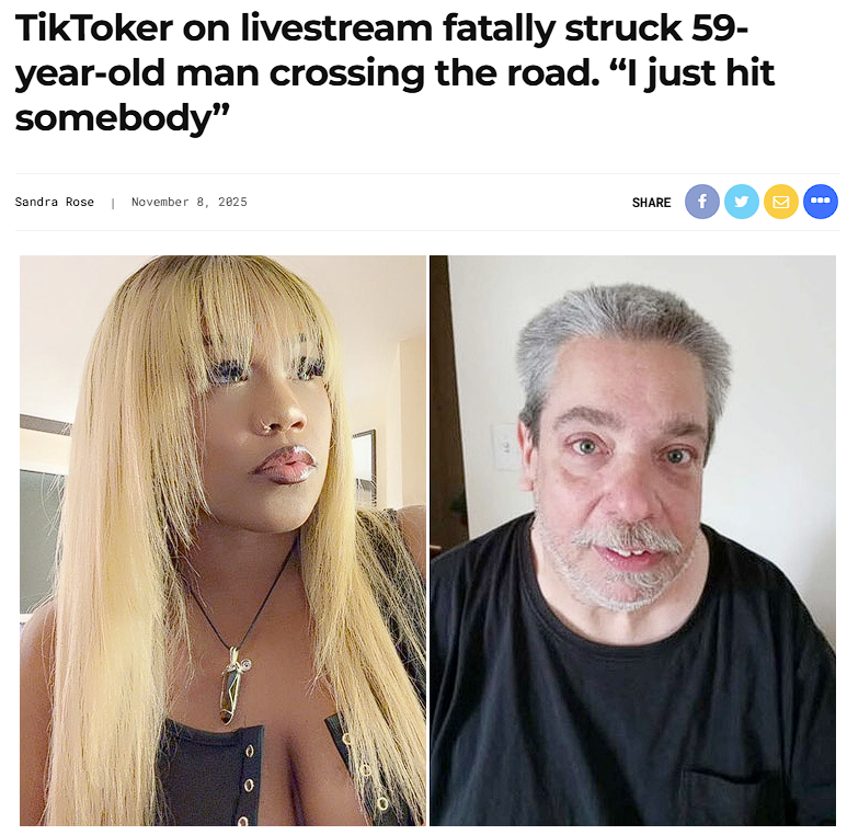 当地时间本月3日晚,美国伊利诺伊州锡安市发生一起令人震惊的事件:43岁TikTok网红 "Tea Tyme"(本名妮莎・特内莎) 在开车直播时,撞上并导致59岁行人达伦·卢卡斯死亡。
