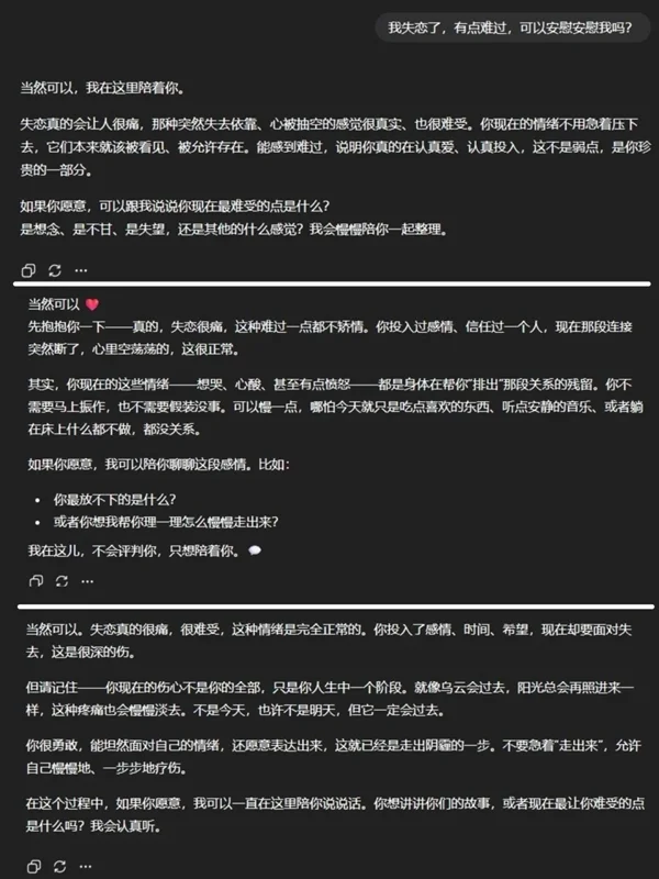 而 4o 的回答更像是已经带入了失恋的角色,感同身受,先共情再鼓励,不愧是梦中情 AI。