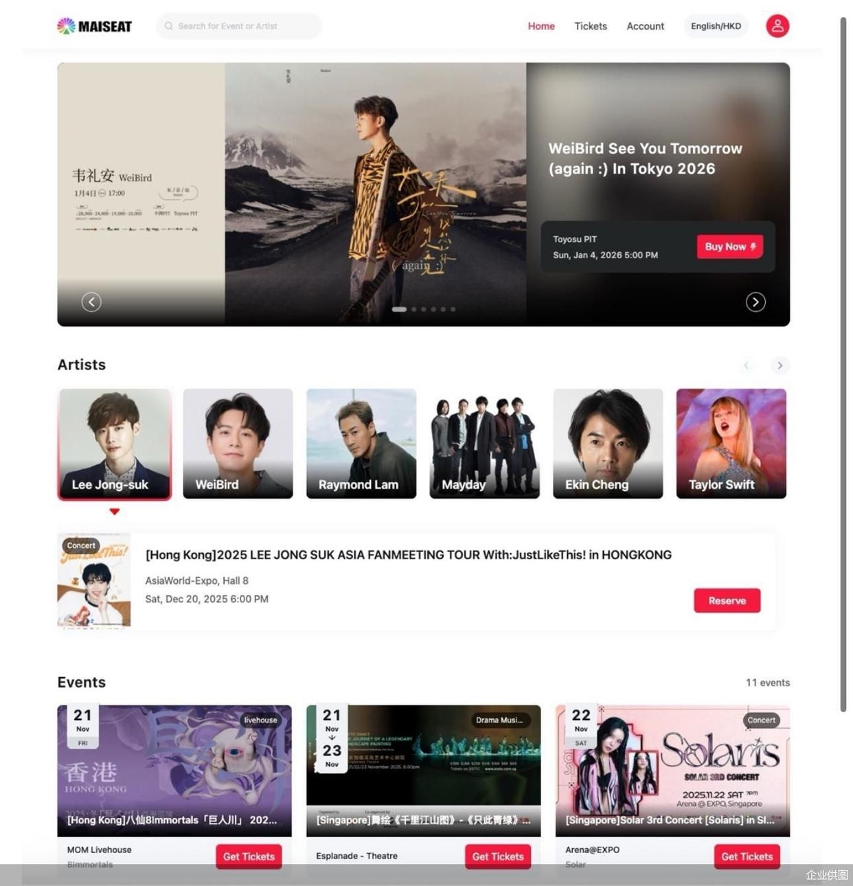 今日,大麦娱乐宣布推出旗下全新业务品牌、全球演出服务平台“大麦国际(MAISEAT)”。该平台面向全球用户提供海内外演唱会、体育赛事、音乐节、戏剧等各类热门演出的购票、观演服务。