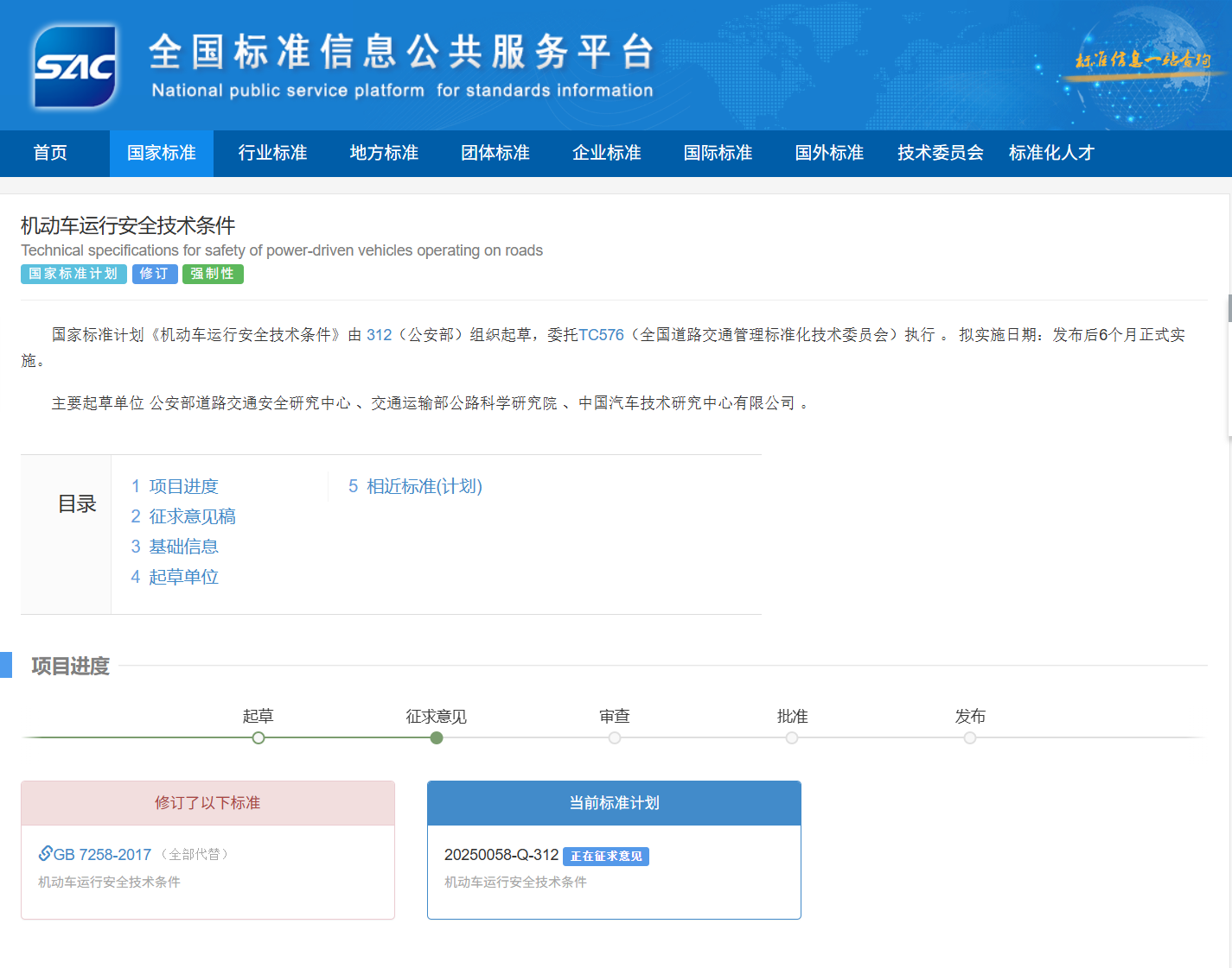 我们从全国标准信息公共服务平台获悉,国家标准计划《机动车运行安全技术条件》由 312(公安部)组织起草,委托TC576(全国道路交通管理标准化技术委员会)执行 。 拟实施日期:发布后6个月正式实施。