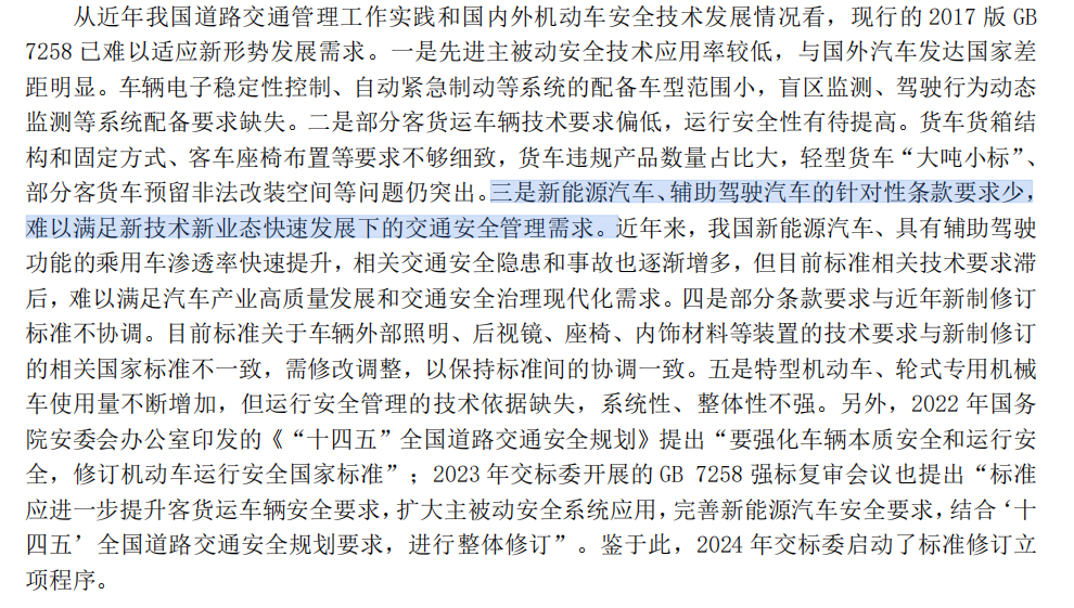 编制说明中明确提到,从近年我国道路交通管理工作实践和国内外机动车安全技术发展情况看,现行的2017版GB7258已难以适应新形势发展需求。