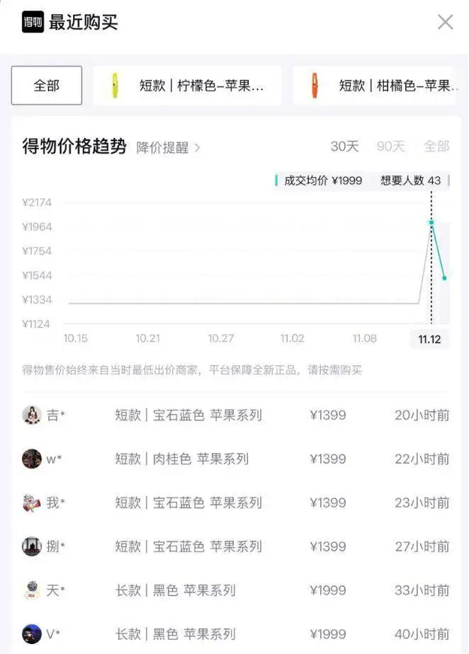 有媒体报道,这款产品备受果粉热议,得物App数据显示,iPhone Pocket长款市场价上涨到2399元,短款价格上涨到1699元,最高溢价500元。