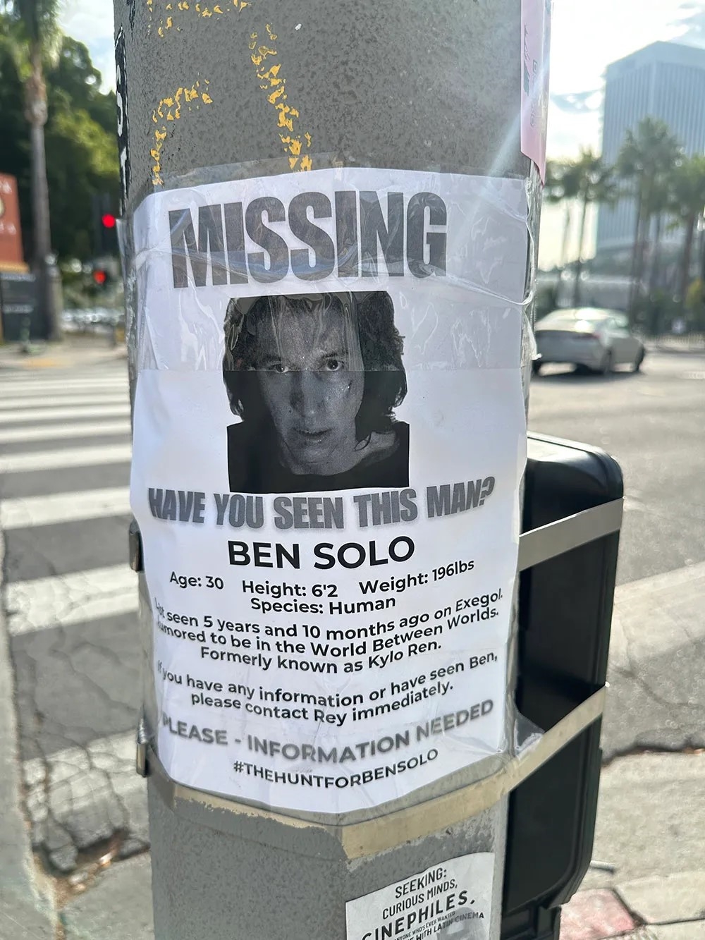 寻找本·索罗的布告也贴到洛杉矶大马路的电线杆上,布告上列明的失踪日期在五年零十个月之前,即星战9上映之时(2019年12月):