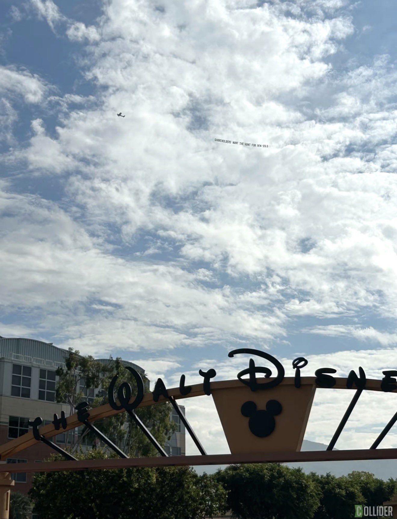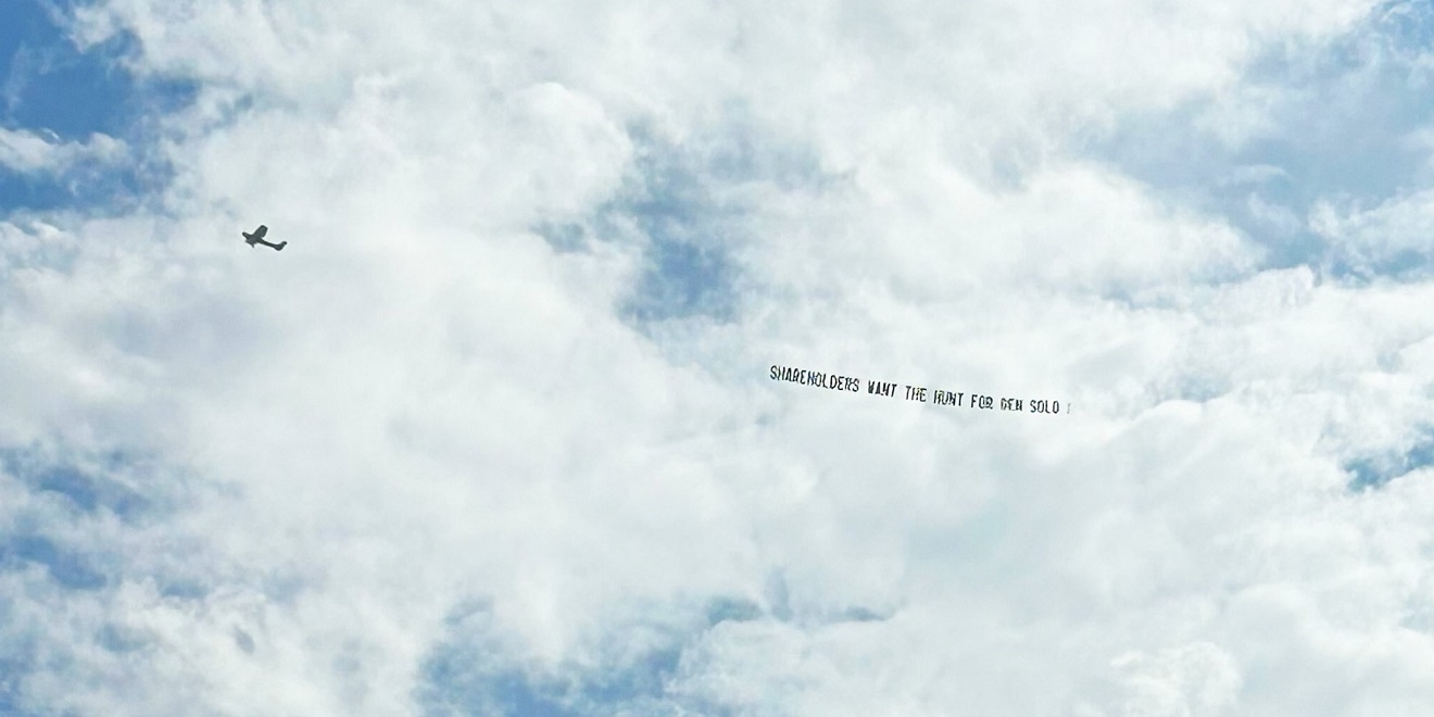 这下粉丝可急了,在迪斯尼开财报发布会时租了一架飞机飞越伯克班迪斯尼总部上空,机后拖着横幅:“股东们想得到本·索罗”: