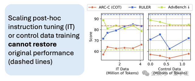这说明,即使事后进行大量指令微调或使用高质量数据进行重新训练,也都无法完全恢复模型的初始性能。