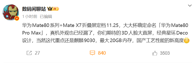 从外围爆料来看,华为Mate 80系列将首发麒麟9030,搭配最大20GB内存(国产定制方案),达到国产工艺性能的新高度。