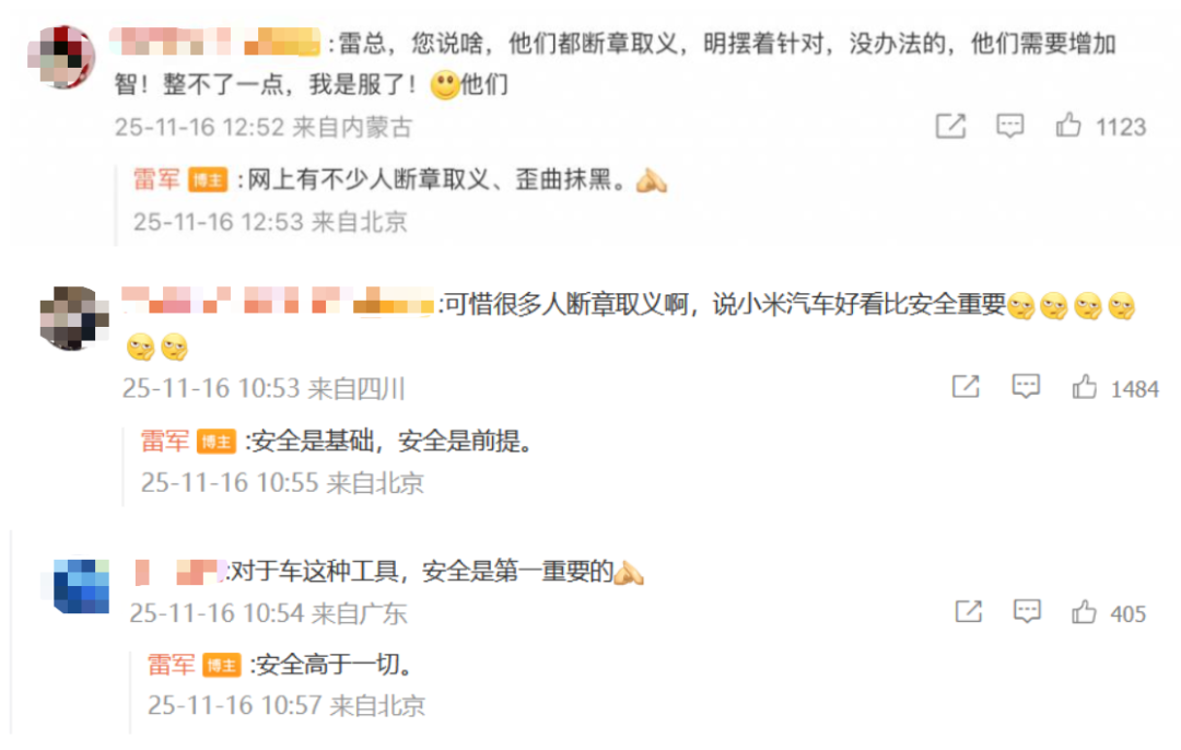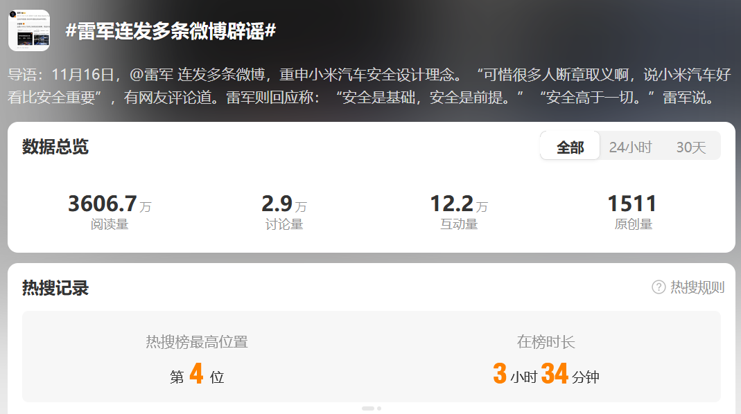 “网上有不少人断章取义、歪曲抹黑。”雷军终是没忍住,公开回应了。这位一向以“劳模”和“温和”形象示人的小米创始人,突然在微博上火力全开,连发多条动态。语气也是十分罕见的带有情绪,句句回应外界对小米汽车“重颜值、轻安全”的质疑。讨论度随之骤起,把“雷军辟谣”相关的词条也带上了热搜。