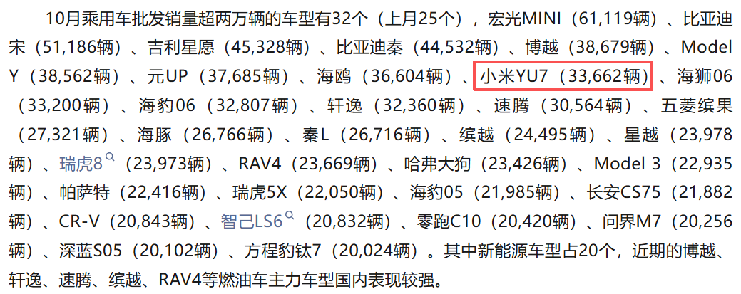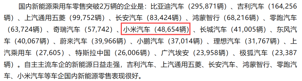 且乘联会10月公布的详细销量数据显示,小米汽车10月销量达到48654辆,在国内车企的新能源乘用车零售销量榜单中排到第八,在新势力车企和品牌中排第三。