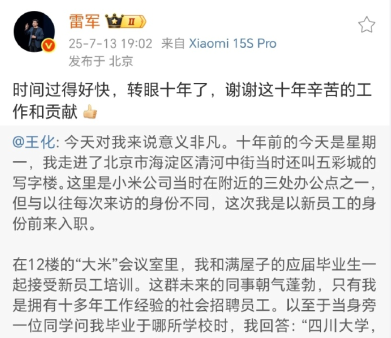就在今年7月,王化入职小米十周年之际,还获得了雷军和林斌的公开感谢。而跟徐洁云一样,王化也因为为人颇有侠气,江湖人称“化爷”,有几次雷军和林斌也都直呼化爷。