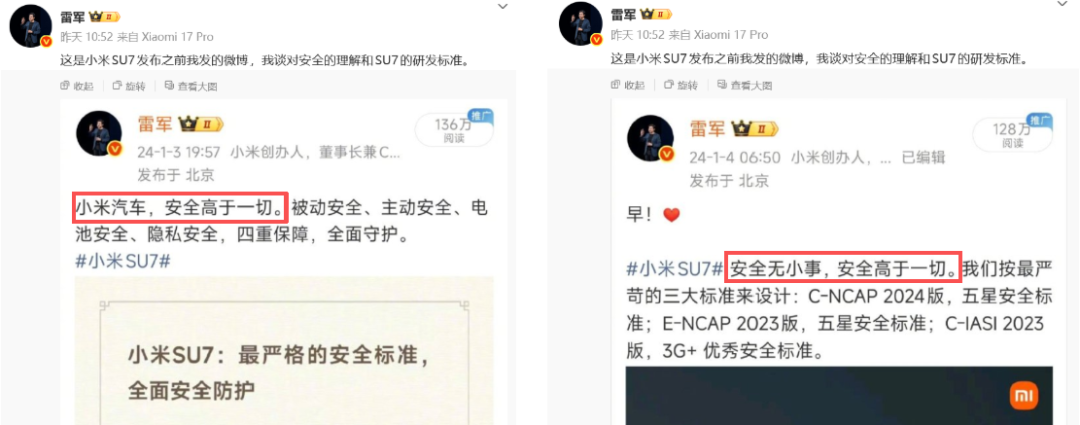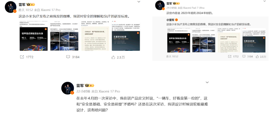 为了自证清白,他晒出了自己在2023年底、2024年初的微博截图,以佐证小米汽车在研发初期,就已确立了严苛的安全标准——