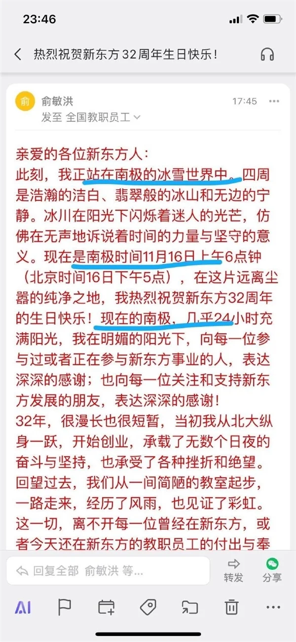 在信中,俞敏洪描述了南极冰川、企鹅等景象,借“企鹅靠体温坚守”强调新东方坚守初心、彼此扶持的团队精神。